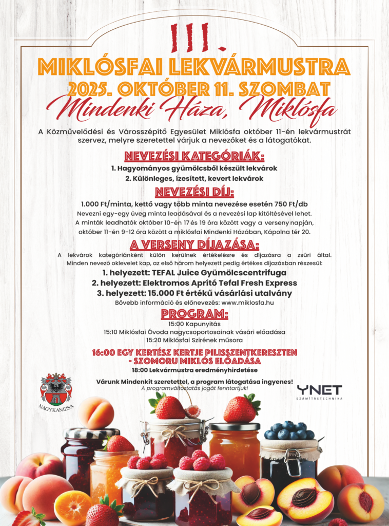 A Közművelődési és Városszépítő Egyesület Miklósfa október 11-én ismét lekvármustrát szervez, melyre szeretettel várjuk a nevezőket és a látogatókat.